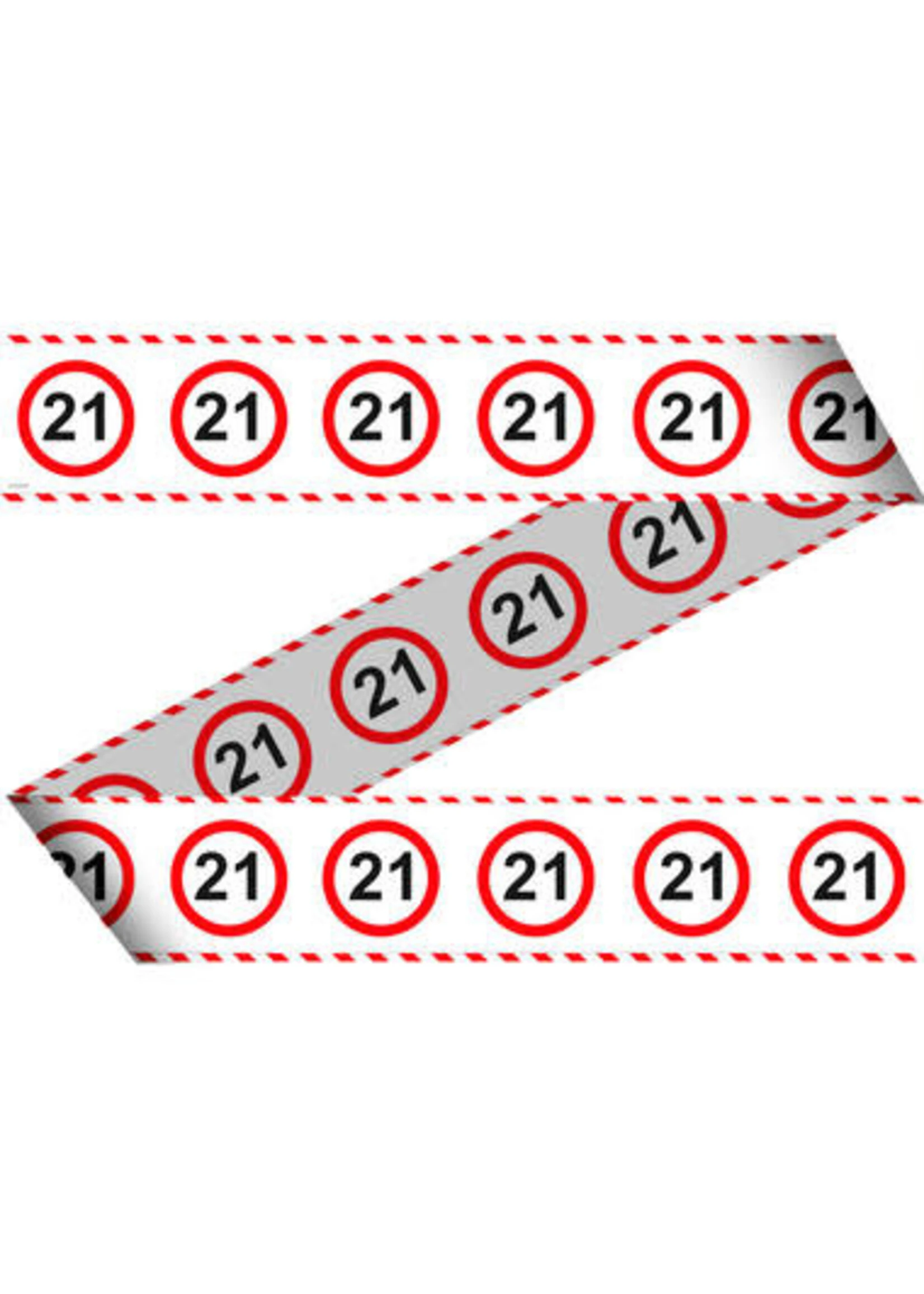 Versier de feestruimte met dit leuke afzetlint met de cijfers 21 erop, het is in het rood zwart wit en maar liefst 15mtr lang.