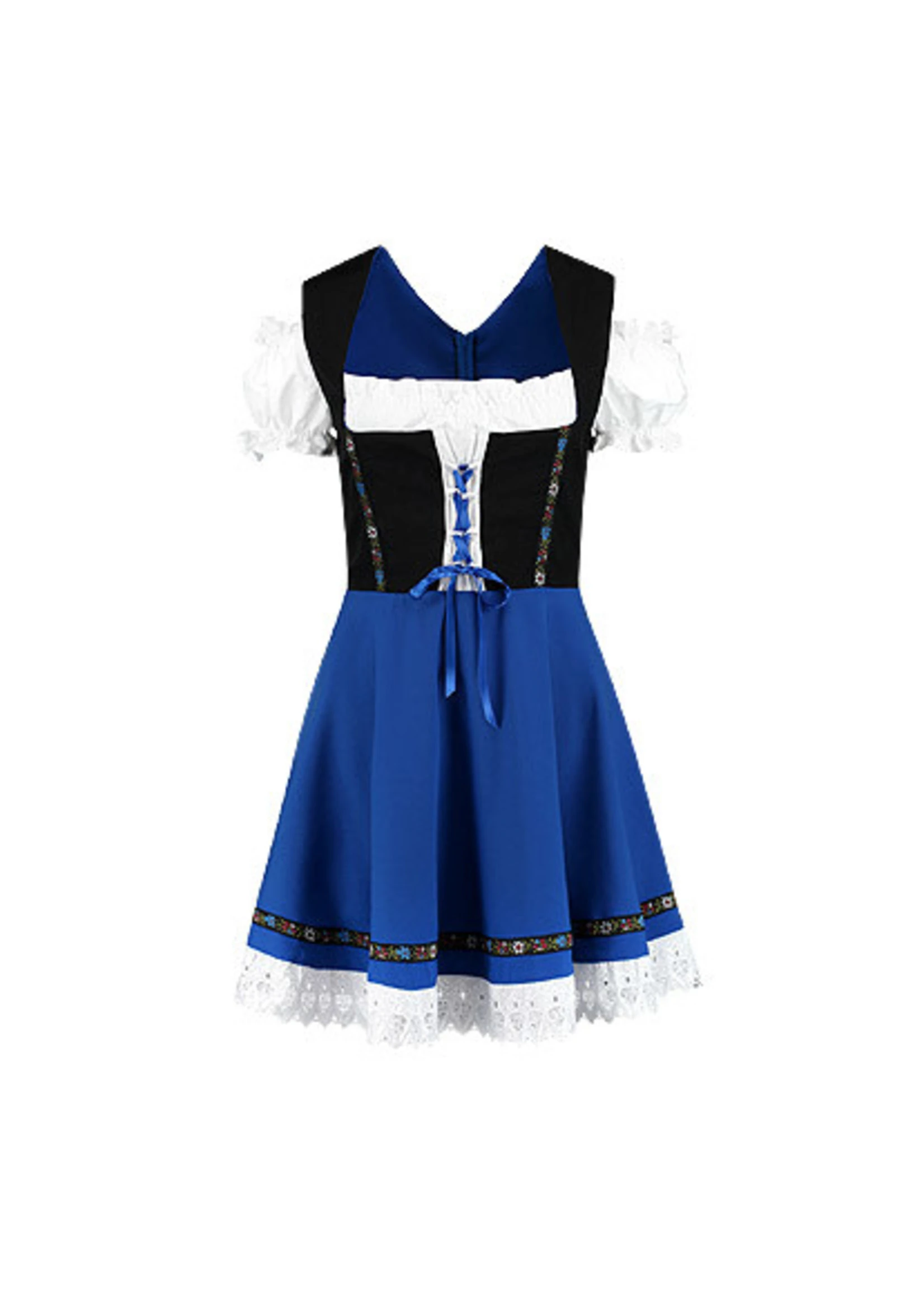 Dirndl met zwart lijfje en blauwe rok, afgezet met wit kant.
