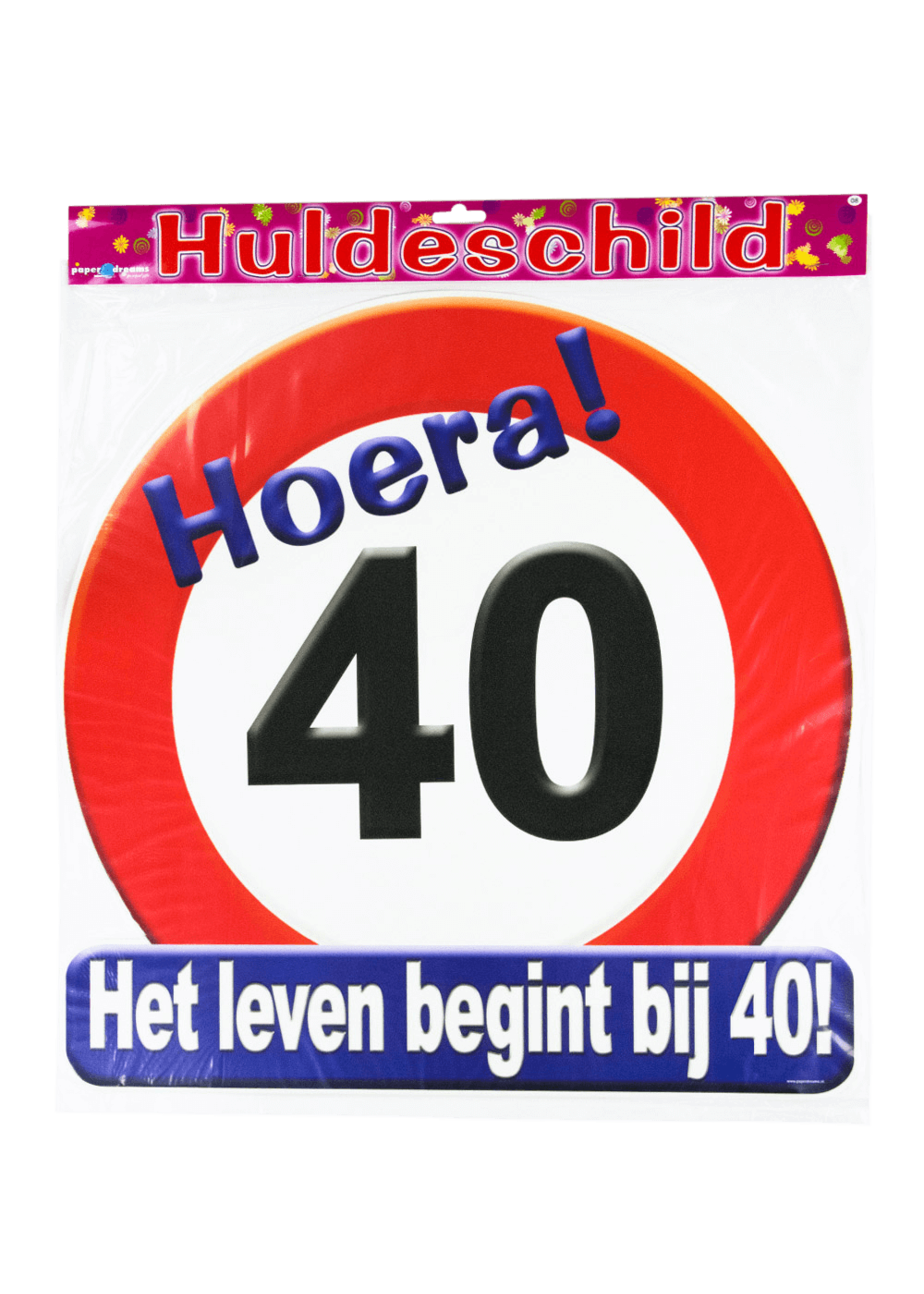 Met dit huldeschil laat je iedereen zien waar er iemand 40 jaar geworden is en waar het feestje gevierd wordt.
