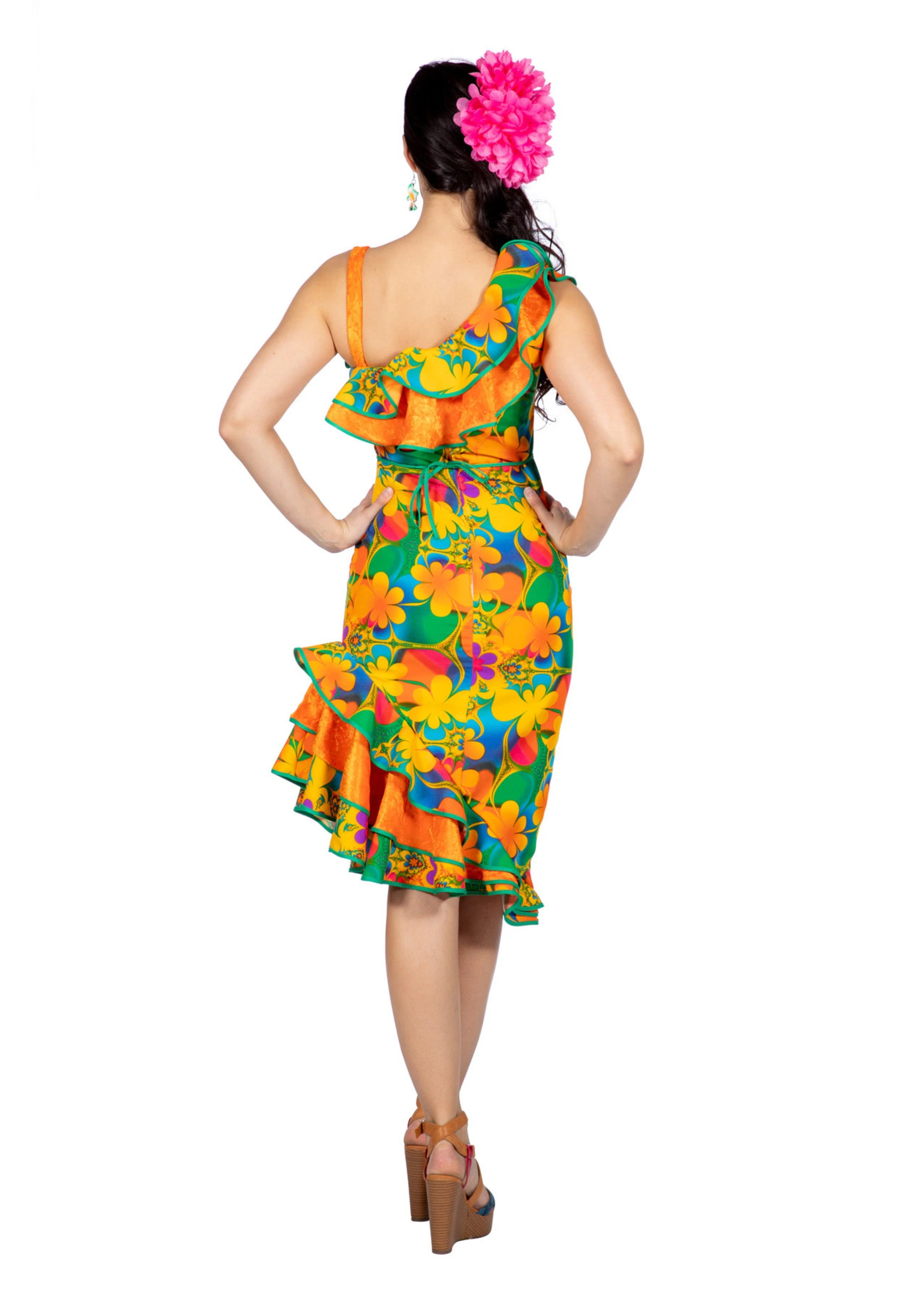 Hawaii jurk in het oranje met gekleurde bloemen er op.
