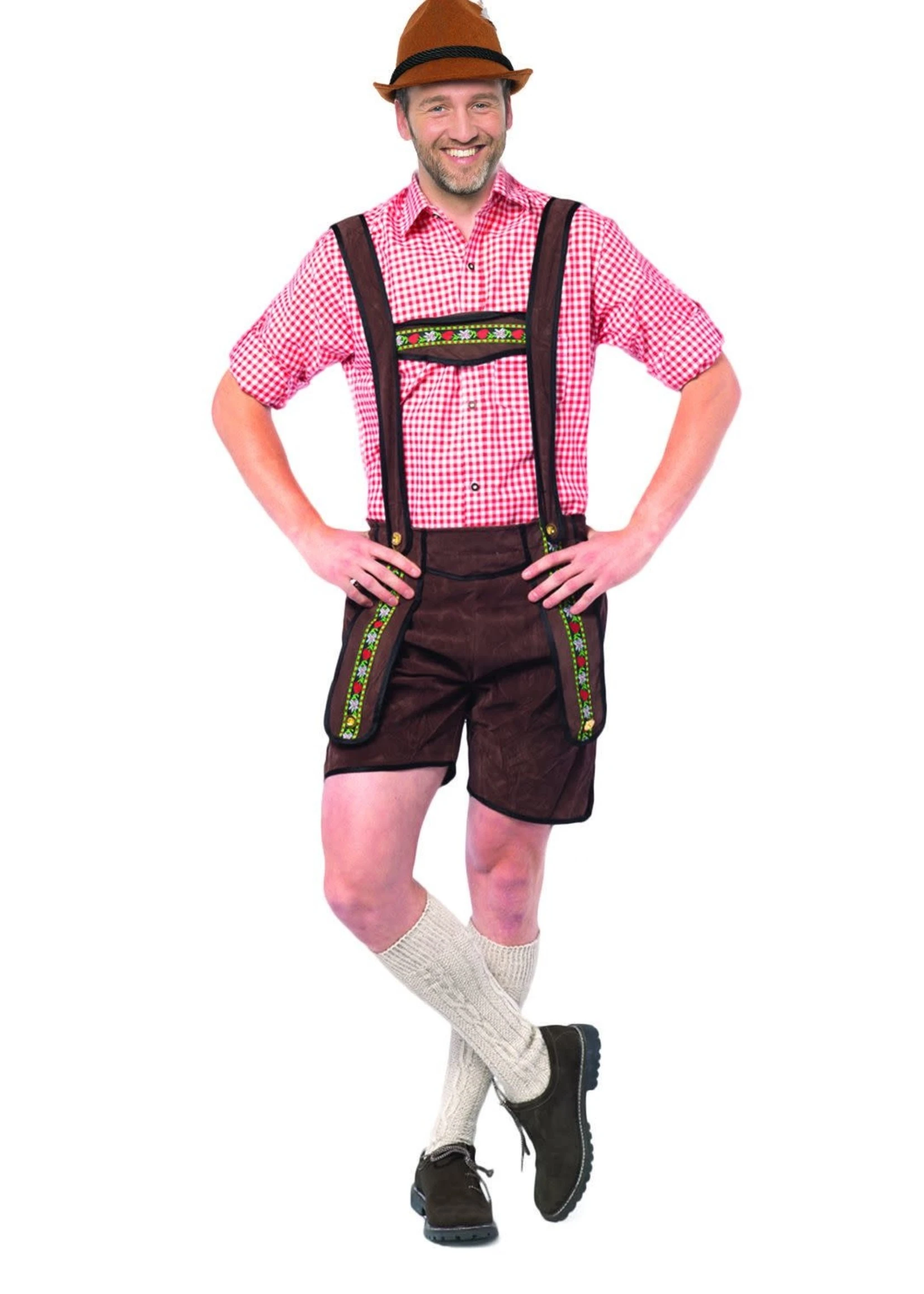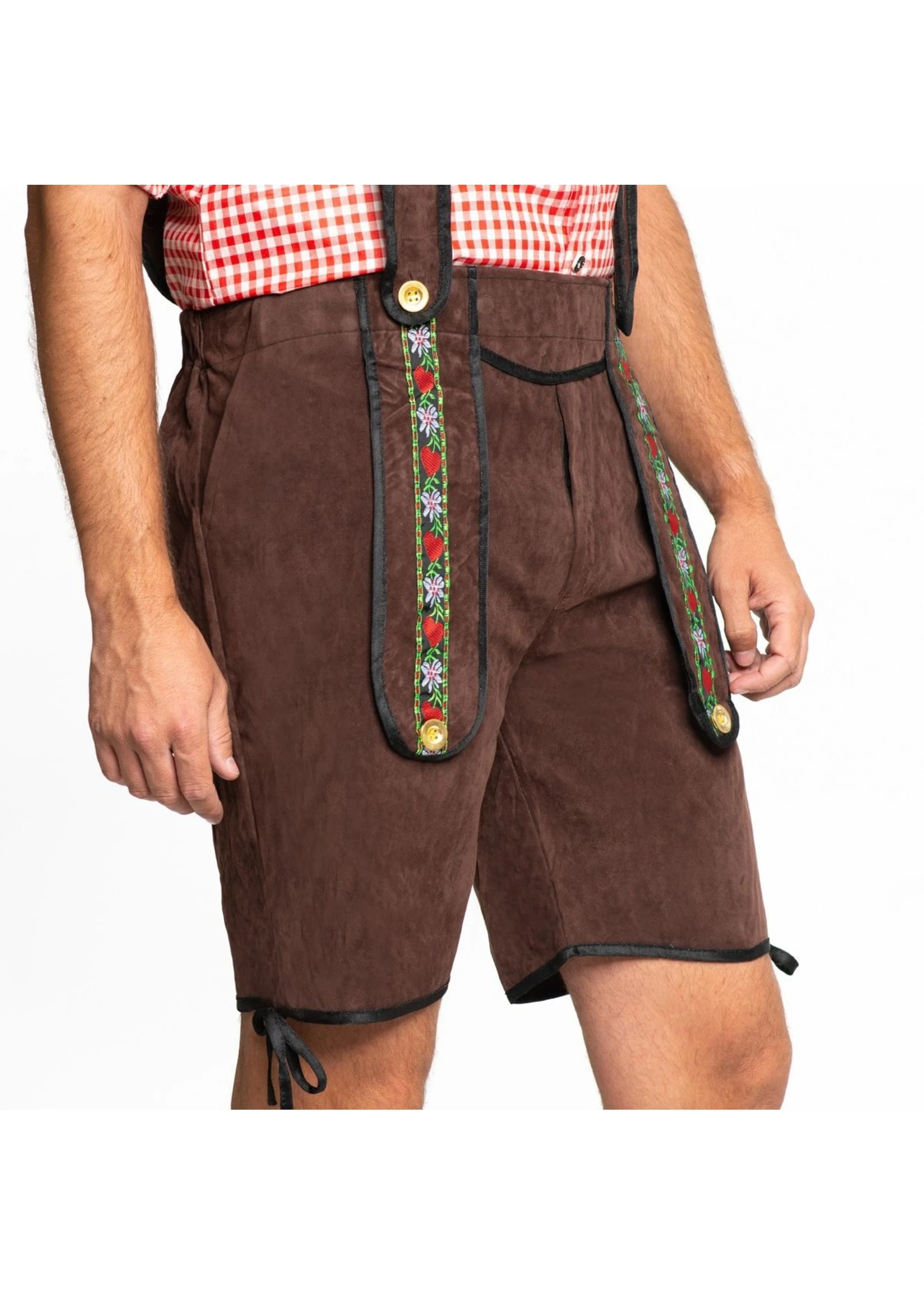 Donkerbruine lederhose voor Oktoberfest, carnaval en themafeest landen (Duitsland, Oostenrijk).
