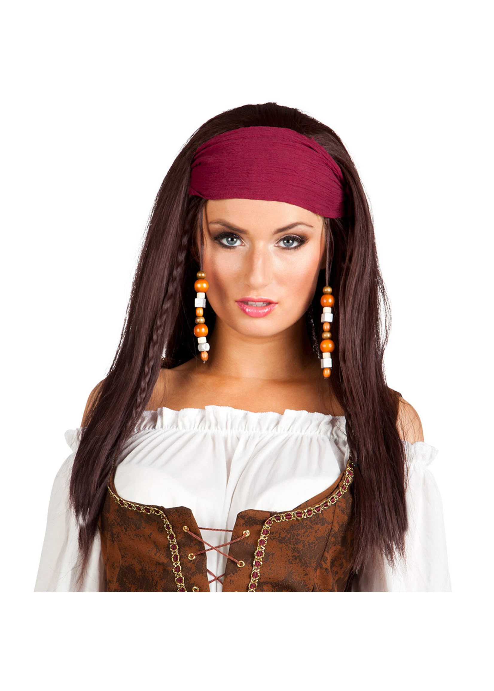 Maak je kostuum compleet met deze mooie piratenpruik, hij heeft donkerbruin haar met kralen en een bandana, hij is 100% polyesther en niet wasbaar. leuk voor een themafeest, Piraat.