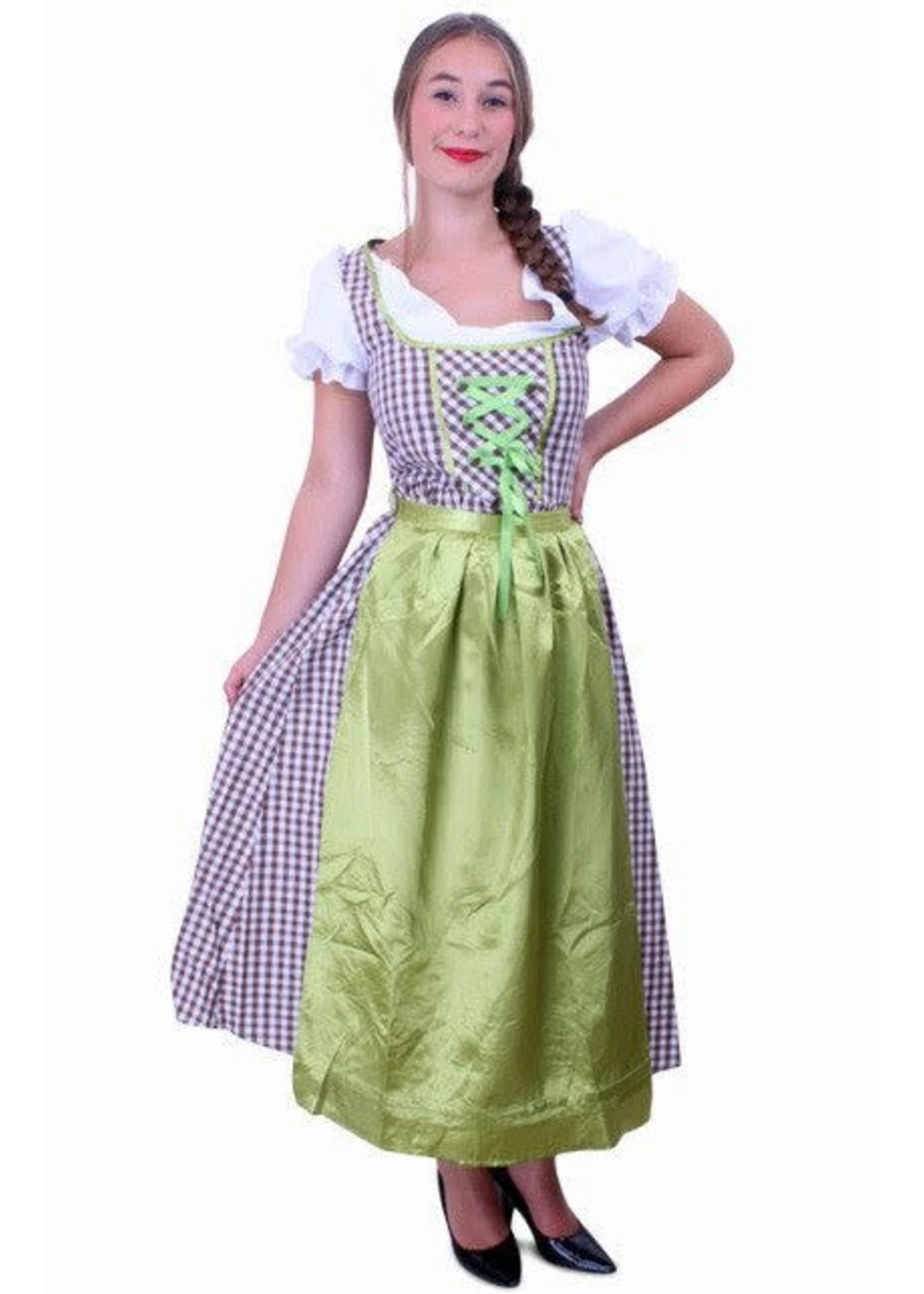Bruin wit geblokte Tiroler jurk met lange rok en groen schort.
