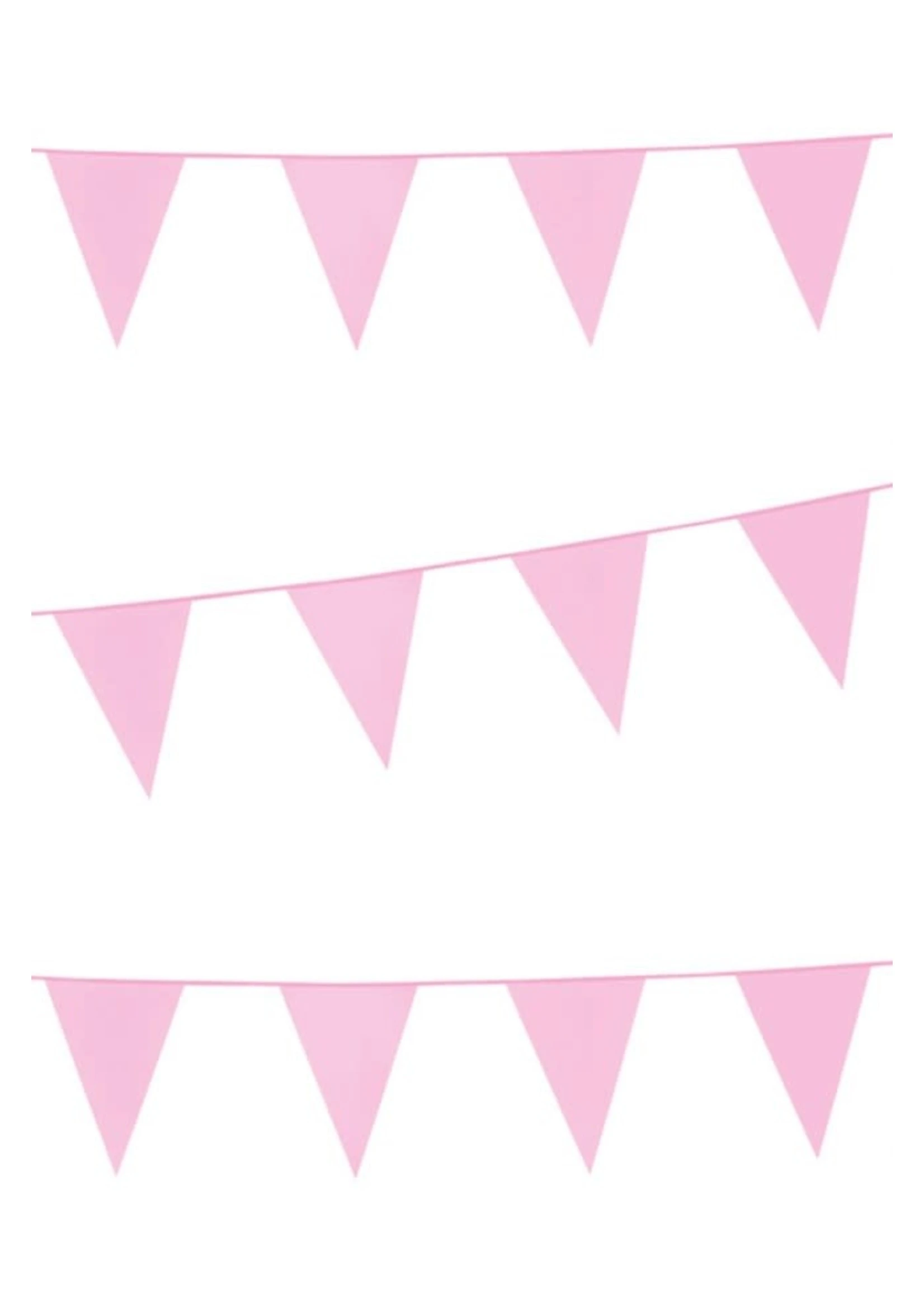 10 Meter roze vlaggetjes. De vlaggetjes hebben de afmetingen van 20 x 30 cm. De roze vlaggenlijn is makkelijk op te hangen en ook bij een baby shower zeer feestelijk.